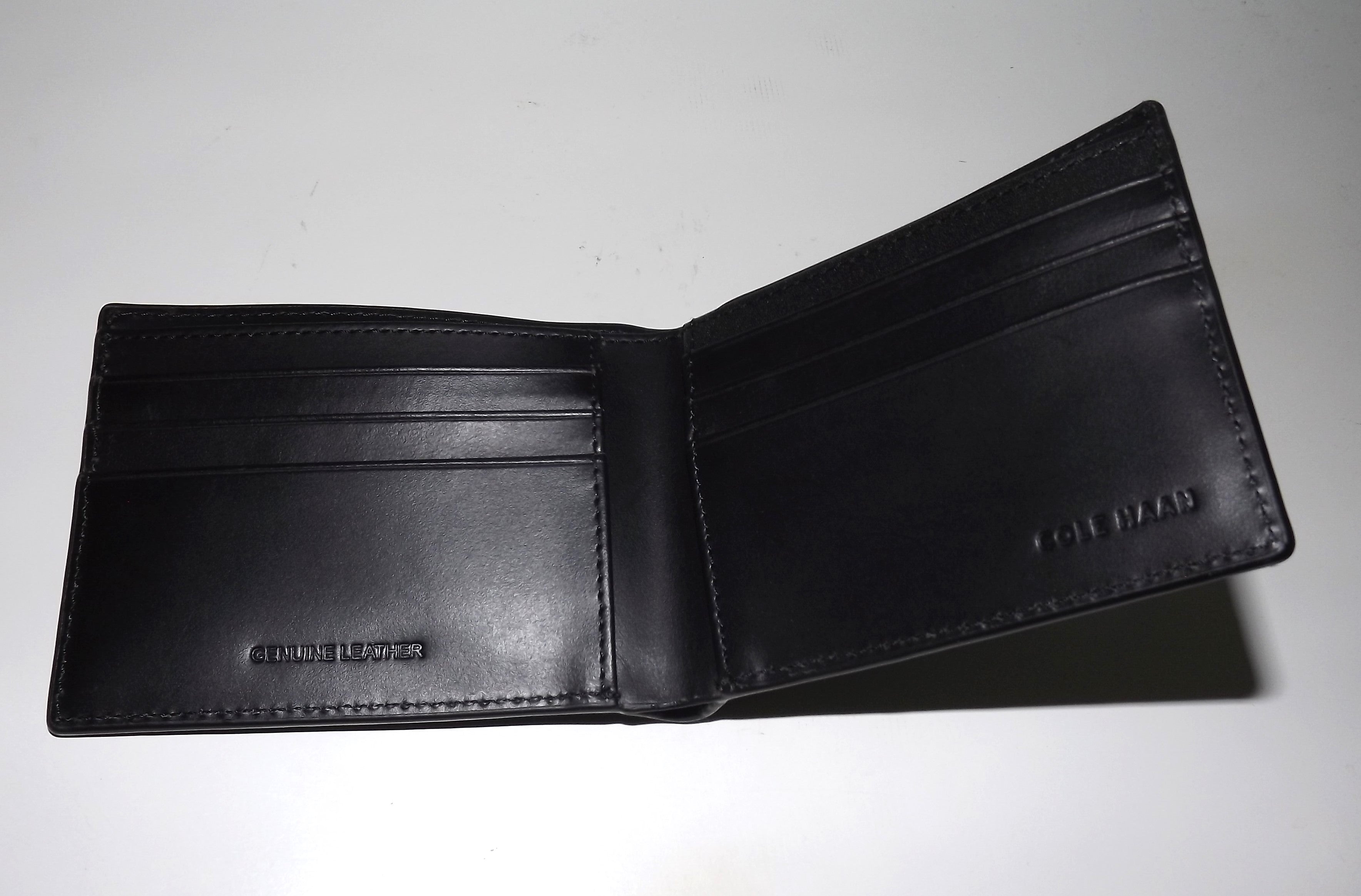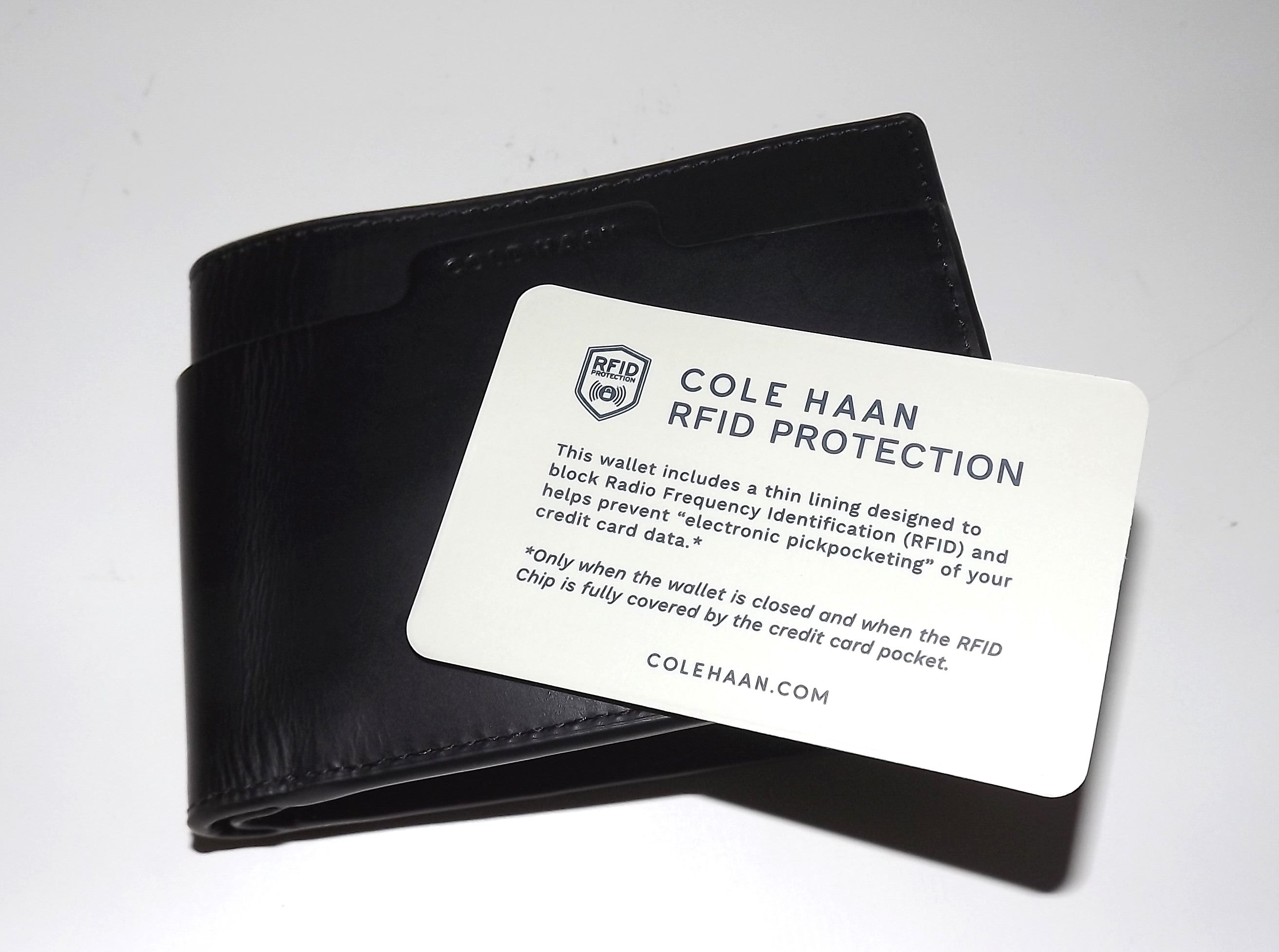 This Bifold wallet from Cole Haan is constructed from a smooth leather with built-in RFID protection. Features include 6 cedit card / ID pockets, currency compartment and 2 receipts pockets. The perfect everyday wallet!