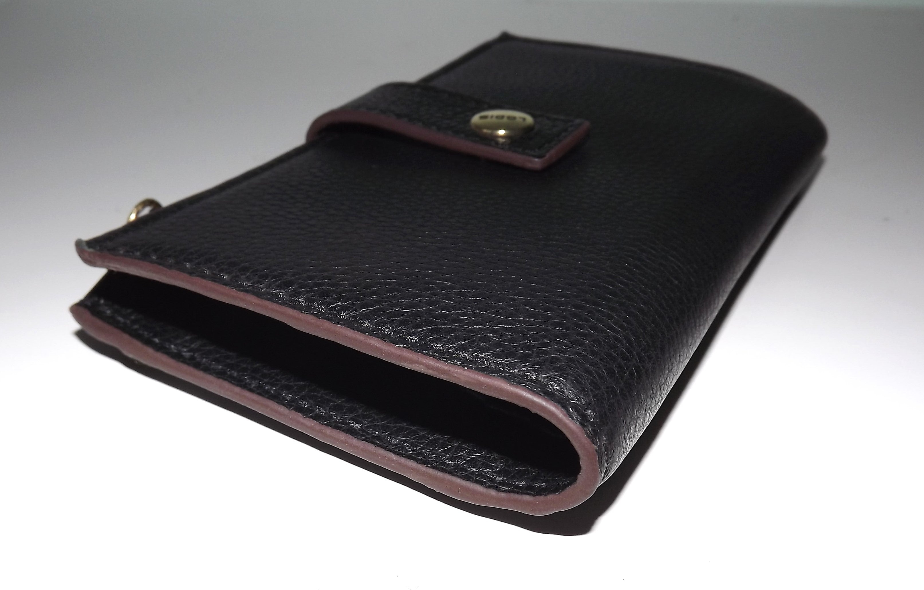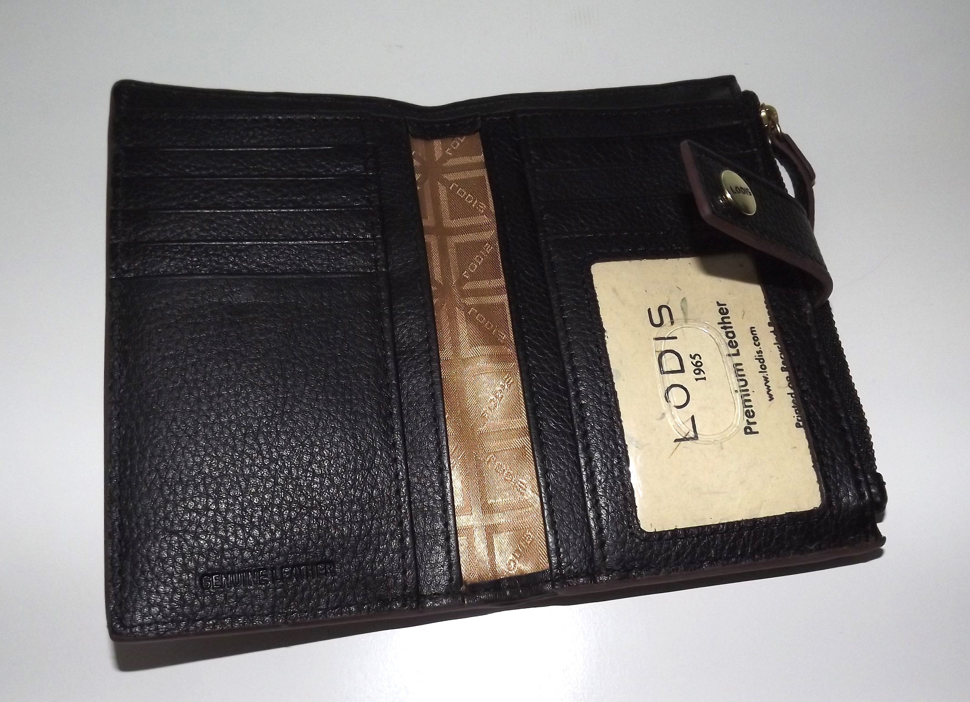 Interior features 8 credit card slots, clear ID window with thumb slide. 4 receipt pockets, currency compartment for bills and a zippered change pocket