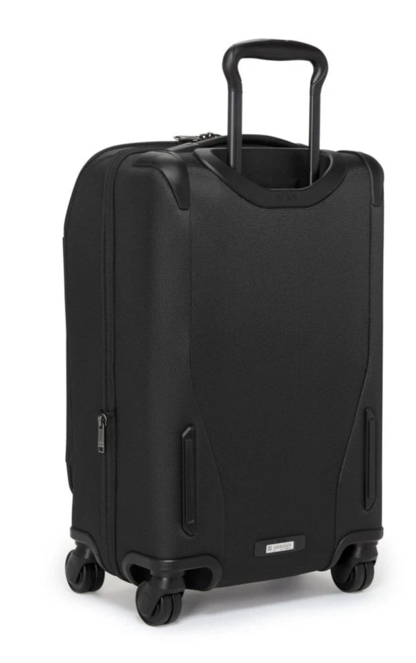 Constructed from Tumi's signature ballistic nylon with leather details, the Merge International Carry-on is a highly functional business bag that embodies both timeless and modern style. This well-designed bag is ideal for everything from weekend getaways to international business trips and is expandable for added packing capacity when needed. The duffel style opening and front grab handles make for lifting convenience and ease. 4 dual spinner wheels for effortless mobility. The perfect bag for domestic and international travels.